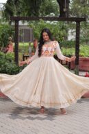 Bring grace to your festive look with this premium Kora Cotton gown featuring intricate multi-thread embroidery and traditional gota patti work. Designed with full sleeves, soft cotton lining, and a 12-meter flair, this gown blends comfort and elegance, making it perfect for Navratri and festive occasions.